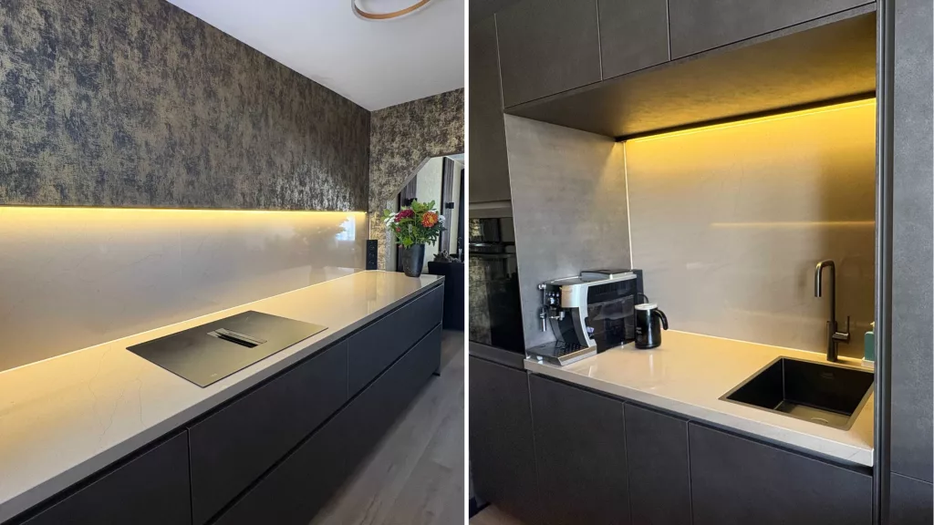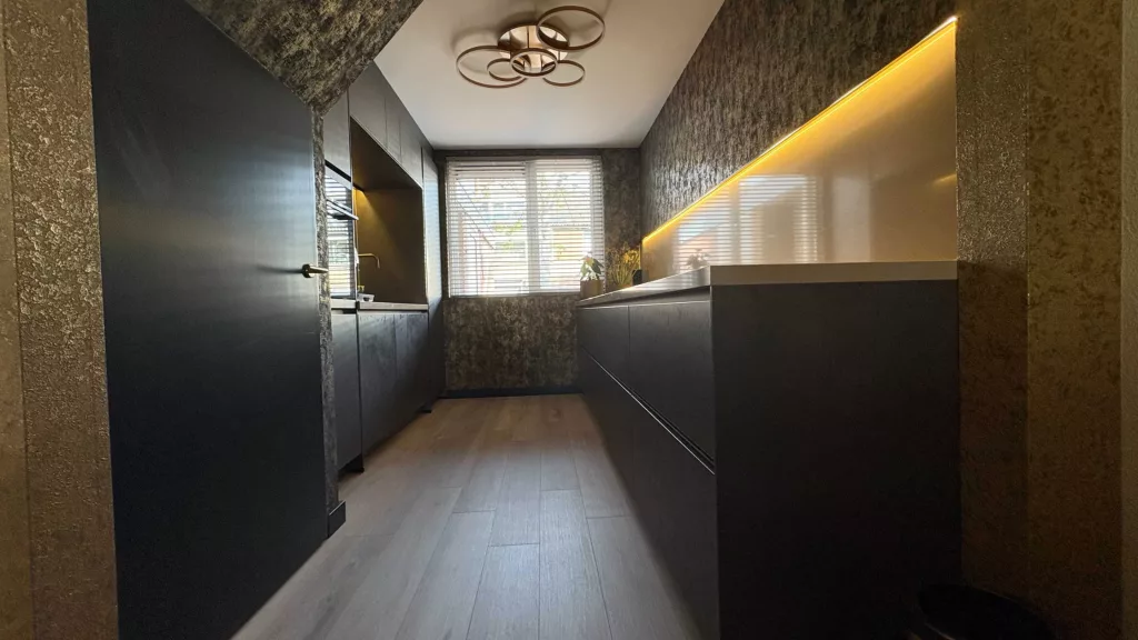 In hun prachtig gerenoveerde woning in Rijnsburg staat nu een sfeervolle, volledig greeploze parallel keuken van Nobilia in betonlook terragrijs. Deze is gecombineerd met een bijpassend composiet werkblad van Dekker Zevenhuizen in de kleur Igea Beige. De doorlopende achterwanden zijn uitgevoerd in hetzelfde materiaal als het werkblad en dankzij de subtiel geïntegreerde, dimbare LED-strips krijgt de keuken een warme, moderne uitstraling.